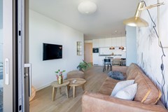 In het midden van het appartement is de gezellige woonkamer gesitueerd waar zich een tv, comfortabele bank, stoel, salontafel en kast bevindt. Het eetgedeelte heeft een ruime 6 persoonstafel en is fijn als je vanuit huis moet werken.