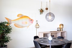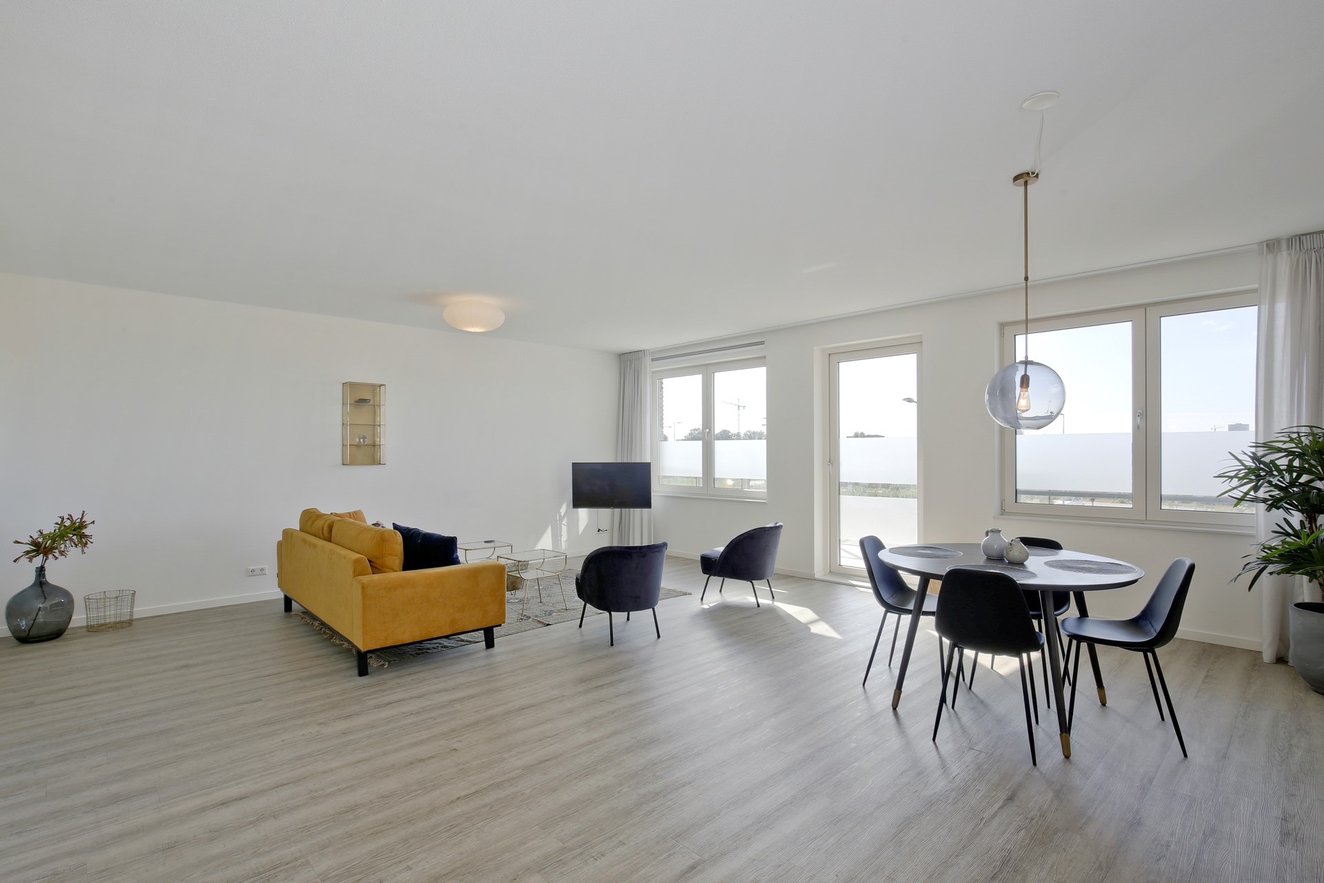 De ruime en brede woonkamer is het middelpunt van het appartement met een comfortabele grote bank, stoelen, salontafel, dressoirkasten en een royale tv. Het appartement ademt vooral de ruimte in met zijn vrijstaande eethoek met 6 persoons eettafel, perfect als u thuis moet werken.