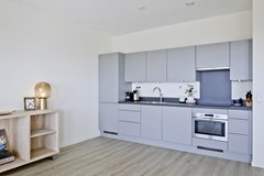 De open keuken is voorzien van inbouwapparatuur waaronder een hoogwaardige vaatwasser, oven en koelkast met vriezer. Alle standaard huishoudtoestellen zijn inbegrepen zoals Nespresso koffiemachine, waterkoker, etc.